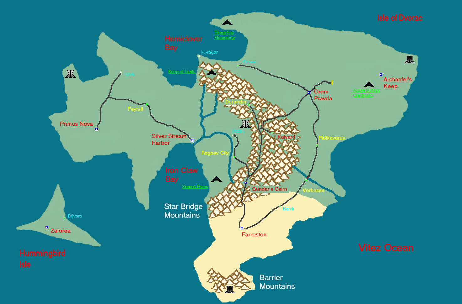This is Dvorac Isle, it is a large island in the western hemisphere. It will be the main focus of the world of Tourmaline in the upcoming game, Neverwinter Nights. It is not the only landmass on Tourmaline but it is the only feasable portion that will be created for gaming in NwN, so please enjoy.
