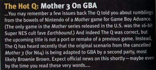 Somehow I don't believe it's been this long, but whatever, Mother 3 is coming and now we know it. Here's the scan, heres the Party. What more can I say? Brownie Brown, taking the place of APE inc, will be in charge of some key development points. Although the name sounds.. lets say, kiddie, they aren't n00bs to the bussiness. They were founded from the branch of Squaresoft that made Secret Of Mana.. a 2 player RPG for the SNES, that realy owned. They've had the GBA game "Magical Vaction" which has very impressive graphics. So, its coming, and thats all there is to say. You might also notice the activites bar, but maybe not, it depends on my laziness factor.
