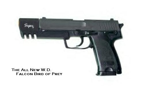 This is THE official handgun of the WD Special operations unit "Falcon Eyes". This special operations pistol features a 15 round clip, extra lightweight body, and a built in silencer. The opposition will never know what hit them!