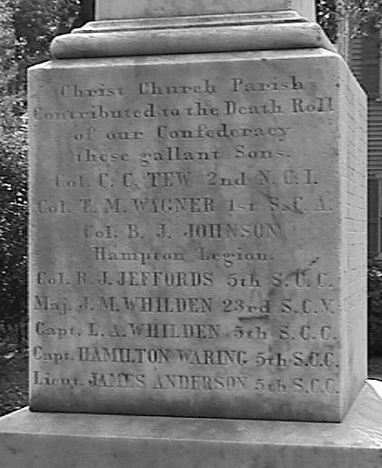 | Christ Church Parish / Contributed to the Death Roll / of our Confederacy these / gallant Sons. / Col. C.C. TEW, 2nd N.C.I. / Col. T.M. WAGNER, 1st S.C.A. / Col. B.J. JOHNSON / Hampton Legion / Col. R.J. JEFFORDS, 5th S.C.C. / Major J.M. WHILDEN, 23rd S.C.V. / Capt L.A. WHILDEN, 5th S.C.C. / Capt HAMILTON WARING, 5th S.C.C. / Lieut. JAMES ANDERSON, 5th S.C.C. | |