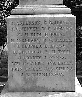 | B. ANDERSON, G.C. JERVEY, / J.C. JERVEY, W.C. JERVEY, / W.H. RICH, H. ROUX, / H. INGLESBY, D.W. MAREE, / J. LEOPOLD, D. AYERS, / D. TRUESDAL, W.H. TODD, / J. CORBEY, J. OWENS, / WM. CALVERT, JNO. EADEN, / JOHN BAILEY, JAS. SIMONS, / J.R. THOMLINSON. |