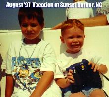 We also went swimming, which was the most fun!On the left is a picture of us on vacation a few years ago. (Those were the days before the "little sister".) We had a great time at Sunset Harbor, NC. We visited the NC Aquarium and saw lots of cool things. There were sharks in a huge tank, and a place where you could pet the starfish and other animals. We had to ride on a fairy to get there. That is where this picture was taken. We saved french fries from our lunch and fed the sea gulls on the way back.
