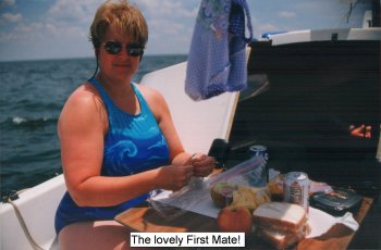 We decided to anchor for the first time ever, a job which Emily handled beautifully, and then went for a swim. Anna Kate even got into the act, splashing around in her fishy critters life jacket! After a very fun time sloshing about and diving under the boat, we all piled back into the cockpit. A tired Anna Kate immediately went forward for a nap. I set up our cockpit table with the new leg ($3.49 at Home Depot) and Emily set a beautiful gourmet lunch for two, complete with romantic dinner music!