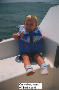 Getting off the dock was another matter, however. The current was flowing several knots from the (crowded) ramp towards a low bridge about 30 feet down stream. A 12-15 knot wind was blowing straight towards the bridge as well. Fantastic First Mate Emily pushed us off at just the right angle and I gunned the motor as the nose swung around. We headed directly into the wind, motoring up the Folly River. We enjoyed the beautiful houses and numerous dolphins rolling as close as 10 feet from the boat. We were headed towards Kiawah Island and did fine until, around Bird Island at the mouth of the Stono River, a huge dredge came along, forcing everyone out of the narrow channel. I took a quick look at the chart, which showed no obstructions outside of the channel, but which DID have an ominous note at the foot saying that the bottom in this area is subject to "continual change."