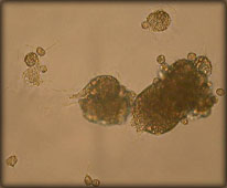 Enigmatic phenomenon was found in co-cultures of hemocytes and embrionic cells. Syncyties of EmbC (large cell in left figure) with very active cytoskeleton were often found in such cultures.