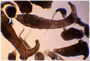 Generally, short-term cultures with rediae derived from naturally infected periwinkles contained only daughter rediae releasing cercariae. However, one redial "clone" in the long-term cultivation experiment at day 90 post culture initiation was found to release several progeny rediae producing germinal material (blue arrows). Though these young rediae initially were very active, they did not grow, their germinal balls did not increase in size and they died within 3 weeks.