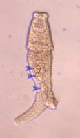 Once transferred in the medium, H. elongata rediae showed vigorous bending movements as well as longitudinal and trans-verse contractions. Rediae motility was maintained throughout the entire period of cultivation. Dead or dying rediae were easily identified by their loss of motility and tegument integrity. Long-term cultivation experiment showed 50% survival level for up to 70 days and highly significant between-"clone" differences in survival rate (ANOVA: F(2)=212.5, P<< 0.001). To note, 50% of the rediae in the most robust "clone" survived for up to 163 days, when the experiment was terminated. During cultivation, moribund or dead cercariae, their lost tails and dead rediae bodies (blue arrow) were the only source of food for the rediae. In no case were rediae observed to attack one another. No somatic growth was noted.
