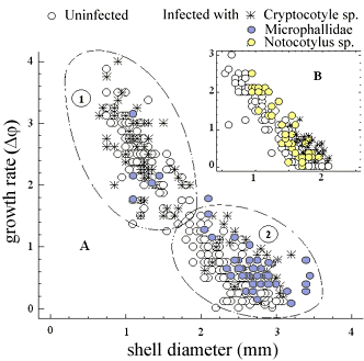 | The effect of at least Cryptocotyle sp. parthenites on the growth of H. ulvae from Sukhaja Bay is age-specific. Snails that become infected before maturity grow at the same rate as uninfected. In contrast, sexually matured individuals show generally increased growth following infection. | |