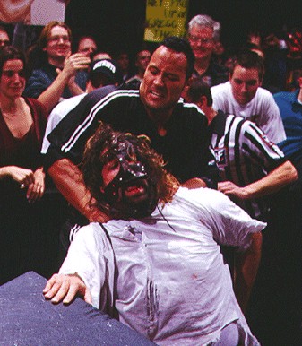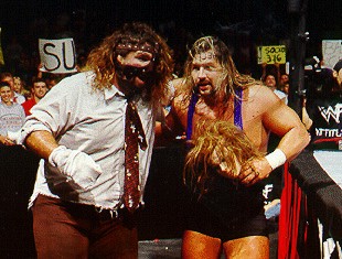 After leaving ECW in 1996, Mick Foley entered the WWF as Mankind, a deranged outcast who wears a leather mask over his face. Mick Foley wasn't actually thrilled with the original concept for "Mason the Mutilator", but he mustered the courage to tell Vince McMahon (WWF owner) that maybe Mankind the Mutilator was a better name. Luckily Vince dropped "the mutilator" before Mankind's first match (along with the Hannible Lector bars over the mouth). Mankind has made a huge impact in the WWF. People love Mankind's antics with Mr. Socko, a sock puppet he wears on his arm when delivering his finishing move, the Mandible Claw, (pressing ones fingers into a packet of nerves under the toungue, which is supposed to cause paralysis). Mankind has become the WWF Champion three times and is one of the most loved superstars in the federation.