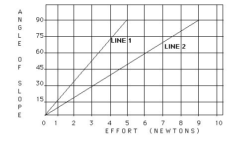 Look at the graph below which shows how the effort required to push 2 different loads up a slope varies with the angle of the slope. One of the loads weighs 5 Newtons and is labeled line 1 on your graph. The second load is unknown and is labeled line 2. Use the graph to answer the questions below.