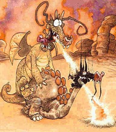 He crawls to the object, pulls it out of the sand, and discovers what looks to be an old brief case. He opens it and out pops a "genie". But this is no ordinary genie. He is wearing an IRS ID badge and dull gray suit. There's a calculator in his pocket. He has a pencil tucked behind one ear.