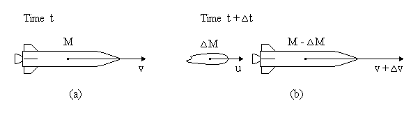 The figure below-left (a) shows the situation at time t. The rocket and fuel have a