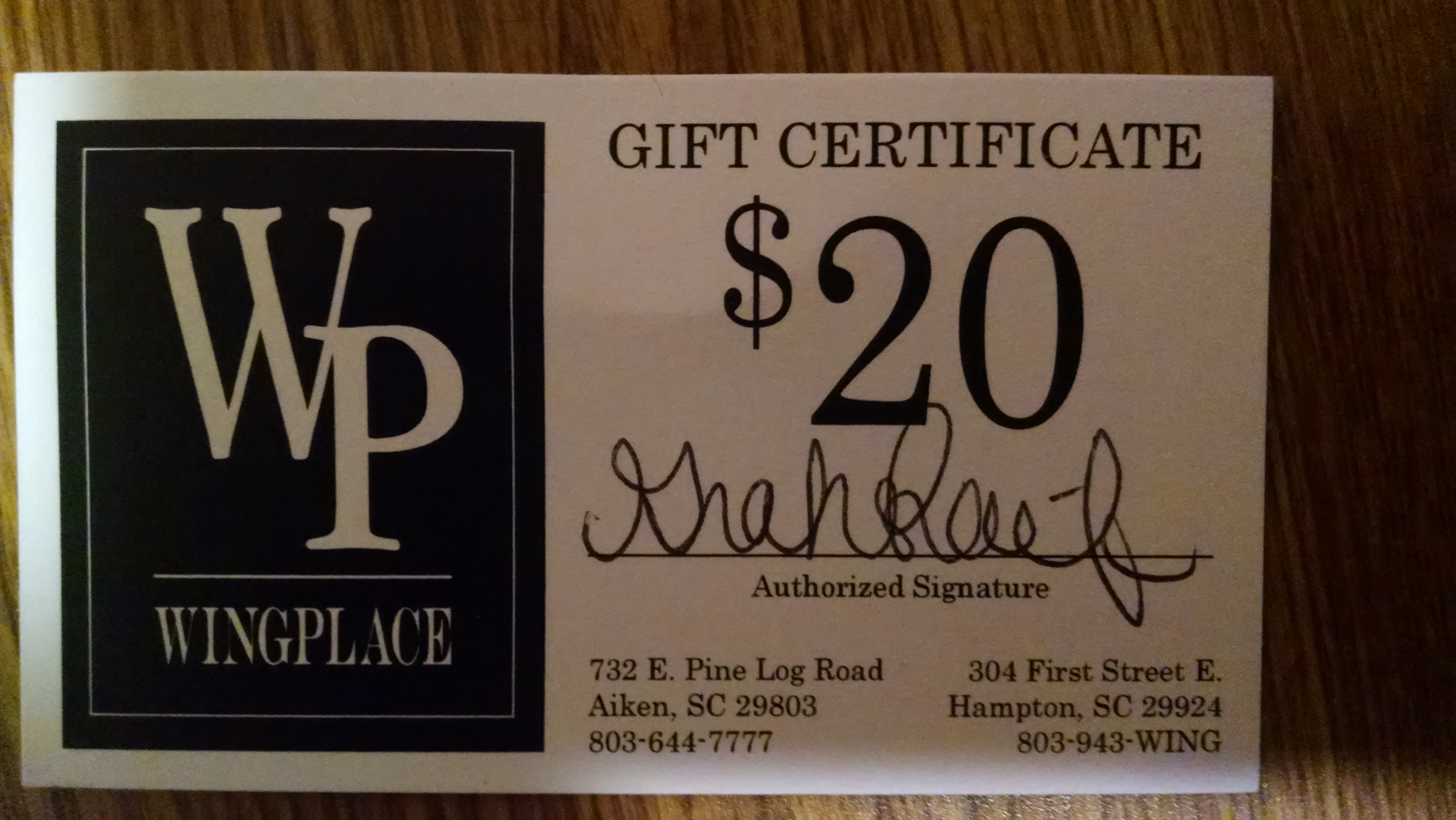 | Gift Card | 20.00 | Wings Place | |