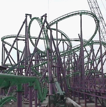 | As guests approach this portal, they can see the converted brownstone warehouse beyond. The Joker has renovated and added on to the old Ace Novelty warehouse, converting it into the "fun house" of his dreams (and our nightmares!). Brilliantly colored and brightly lighted, it beckons to all young Gothamites as a symbol of the rebirth of a tired city. As guests ascend the stairs to the floor above, they notice graphics and graffiti, courtesy of the various gangs which inhabit the bowels of Gotham City. Maniacal laughter and strange songs fill the air. It soon becomes obvious that The Joker's Jinx is a spectacular new type of ride. With great anticipation, guests line up at the loading gates and then board the festive-looking vehicles. The Joker's voice booms over the loudspeakers and suddenly riders are launched out of the station, part of The Joker's twisted plot to trap Batman - The Joker's Jinx! |
