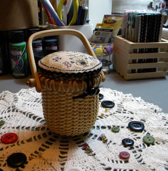 I finished it off on a Nantucket Basket. I hinged it so she can open and use the basket if she wants or she can leave it closed with the closure I added and use it only as the pincushion.