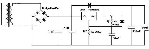 The voltage regulator circuit was constructed using the LM317T, 3 terminal regulator. A heatsink was utilized to cool down the LM317T. The output voltage can be set to anywhere in the range of 1.5 volts to 30 volts. However, for our application we needed a 2.5 volt output voltage. The selection of the desired output voltage comes with choosing appropriate resistance values for R1 and R2. The use of a potentiometer for resister R2 allowed calibration of the desired output voltage. A bridge rectifier was used to receive the AC or DC input. Protection diodes were implemented to prevent the capacitors discharge from running back into the regulator in the event of abnormal operating conditions such as a sudden short circuit on the input or the output or a back emf from the inductive load.