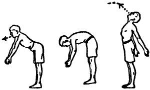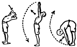 5. Para la parte inferior del cuerpo y la parte posterior de las piernas. Como todos los demás ejercicios, es éste un ejercicio de respiración, por medio del cual se desarrollan los pulmones y el corazón, creando sangre fuerte y sana. En posición de firmes, levantad los brazos hacia arriba y hacia atrás lo más que os sea posible y luego doblaos hacia adelante hasta tocar los pies con la punta de los dedos, pero sin doblar las rodillas.