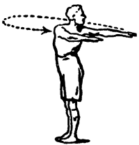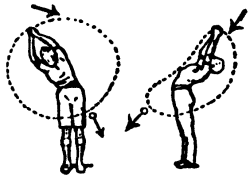 4. Para el tronco. Ejercicio del "Cono". Estando en posición de firmes, levantad ambas manos tan alto como os sea posible sobre la cabeza y enlazad vuestros dedos. Entonces echaos hacia atrás y moved los brazos muy despacio tratando de describir un cono, de tal manera que vuestras manos describen un amplio círculo arriba y alrededor de nuestro cuerpo, el cual deberá girar alrededor de la cintura, inclinándose primero de un lado, después hacia el frente, luego hacia el otro lado y por último hacia atrás. Con esto se ejercitan los músculos de la cintura y del estómago. Repetidlo seis veces de cada lado. Con los ojos deberéis tratar de ver lo que pasa a vuestra espalda.