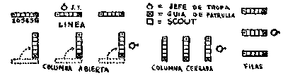 Con una Tropa lista, esta clase de formaciones pueden llevarse a cabo fácilmente sin tener que dar voces de mando; todo lo que se necesita es que el Jefe de Tropa haga una señal e, inmediatamente, todos los Scouts trotan a ocupar sus puestos en su patrulla, todos de frente al Jefe de Tropa.