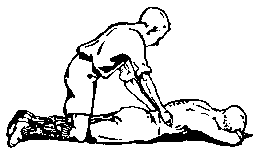 3. Echaos hacia delante con los brazos bien extendidos, haciendo hacia abajo, una presión firme y uniforme sobre las costillas del paciente, mientras contáis despacio por miles: "dos mil, tres mil", comprimiendo así al paciente contra el suelo y obligando al aire a salir de su pecho.