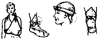 El vendaje de cabeza se usa para sujetar una curación de la piel de la cabeza. Abrid vuestro vendaje triangular y doblad la base a unos cinco centímetros, colocad la a la mitad sobre la frente del paciente, inmediatamente sobre las cejas, de tal manera que la punta cuelgue sobre la nuca; luego, tomad las dos puntas y cruzadlas firmemente por debajo de la base del cráneo y volvedlas hacia arriba para anudarlas con un nudo de rizo sobre la frente. Doblad la punta hacia arriba y prendedla con un broche sobre la coronilla. Tened cuidado de que los dobleces queden bien a los lados de la cabeza y de que las dos puntas queden recogidas.