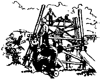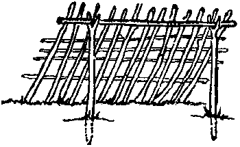 Otra manera de construir una choza es reclinando un palo de dos metros de largo sobre la horqueta de un árbol pequeño, que se encuentre a metro y medio del suelo y luego, colocando palos laterales sobre el anterior y cubriéndolos todos como en el caso del colgadizo; pero teniendo siempre cuidado de que la entrada quede contraria al viento.