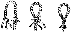 Remate en punta: evita el que la cuerda se deshilache. Destuérzase la cuerda y entrelácese formando una corona. Pásese cada hebra sobre la inmediata y debajo de la siguiente contra la calza de la cuerda. Repítase tres veces.