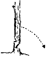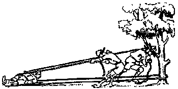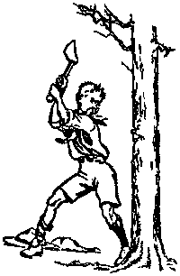 Cortad buenas tajadas en cada golpe; no os contentéis con astillas que solo harán ver a la persona que pase por allí que ha sido un Pie Tierno el que ha estado trabajando. Todo depende de la buena puntería. Cuando el árbol cae hay que cuidarse del cabo o punta inferior entre los dos cortes, pues muchas veces salta hacia atrás. Por tal motivo, jamás hay que ponerse directamente detrás del árbol. Varios Pies Tiernos murieron a consecuencia de esa imprevisión. Cuando el tronco cruje y el árbol comienza a inclinarse, moveos hacia adelante y al mismo tiempo hacia un lado alejándoos del cabo.