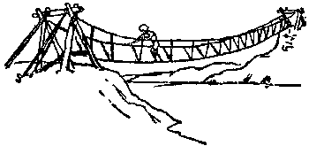 En la India, en los montes Himalaya, los nativos construyen puentes con tres cuerdas extendidas cruzando el río y conectadas de cuando en cuando por palos en forma de V, de tal manera que una forme el paso y las otras los barandales, uno de cada lado.