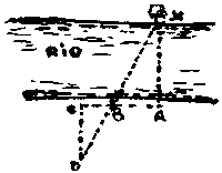 La manera de apreciar distancias a través de un río consiste en fijar un objeto X, tal como un árbol, una roca, etc., en la ribera opuesta a aquella en que se encuentra A (véase el diagrama). Camínese en ángulo recto con respecto a la línea AX unos noventa metros; al llegar a los sesenta, clávese una estaca o colóquese una piedra, B. Al terminar de recorrer la distancia, es decir, treinta metros más adelante de B, en C, dóblese a la derecha y en ángulo recto, camínese tierra adentro, contando los pasos hasta que la estaca y el árbol queden en la misma línea. El número de pasos será igual a la mitad de la distancia entre A y X.