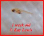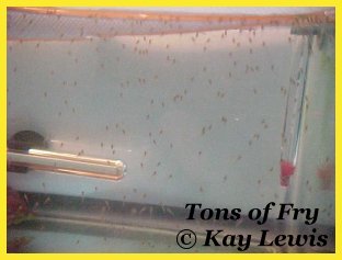As the fry become free swimming they are fed 4 to 5 times daily on infusoria, baby brine shrimp - (newly hatched), and liquid fry food for egg layers. This is slowly dropped into the tank through the slits in the plastic, using a eye dropper. As the fry grow other live foods can be added to their diet. The more live foods and the more space they have to grow in, the faster they will grow, developing larger and more colorful fish.