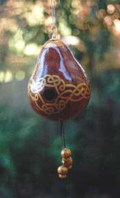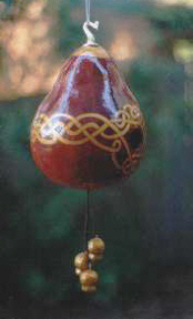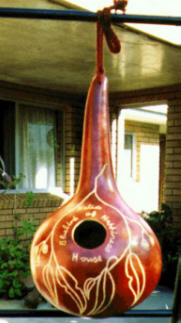 Dan Stalker sent this beauty to Ronna Wuttke. Here's what Ronna wrote to the gourdpatch: I received my bird house today from Dan Stalker in Australia!!!! It is absolutely beautiful!!!! It is a burgundy color with a wood burned and gold sort of weaving pattern around it...similiar to celtic knots. Dan said it was the first one he ever crafted and I feel very fortunate. It has 3 tassels made out of gumnuts... great pods..they are painted gold and resemble the top of mosques...very neat!!!