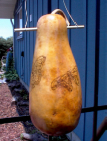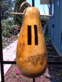 From Chris Lalone to Colleen Proffitt. Colleen had this to say about the gourd gift she received: I adore the shape. My photo does not do justice to the delicate coloring of the pyroengraved leaves and flowers around the hole for the bird. It is just beautiful and I feel so lucky to have received it.