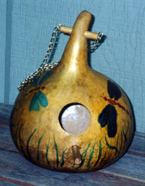 A note from Iris: Hi.....just got back from a 3 week vacation and found my birdhouse at the PO waiting for me. It is a wonderfully crafted birdhouse with a golden glow over-all and fireflies painted on it. Teri Van Patten sent it and enclosed a note with a wonderful sentiment: "...dragonflies...symbolize our ability to soar over the rough spots in life and to transform problems into triumphs. May you always soar". All in all it was a terrific welcome-home surprize for me!