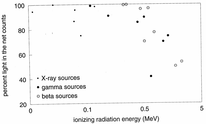 At higher energies, large number of ionizing radiations escape through space within the atoms of their origin with no loss of energy. Only a few will loose minimum energy at eV level that results in forming a thin photon population of electromagnetic radiation, with relatively low energy in eV level, available to excite valence electron. For this reason, a fall in percent light with increase in energy of ionizing radiation in the case of X-, γ-, and β-sources can be evident in Fig.5. Moreover, fall in percent of light from X-ray sources seems to have a trend different from that of γ-, and ß- sources suggesting that the percent light emission from a given source depends upon both the type and energy of its ionizing radiation emissions.
