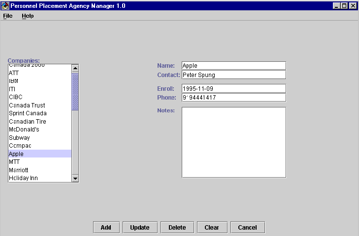 Pictured below is the Java Application our team constructed during the second phase of the Java Project. The Application allowed data processors to enter companies interested in using the Personnel Placement Agency services into our Data Base. Once entered the company information would be stored. This information would be used when open positions were entered on another form. The user simply matched the company name with the position and this information would be stored in the data base.