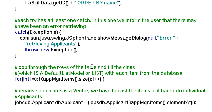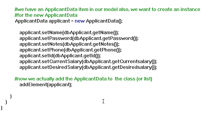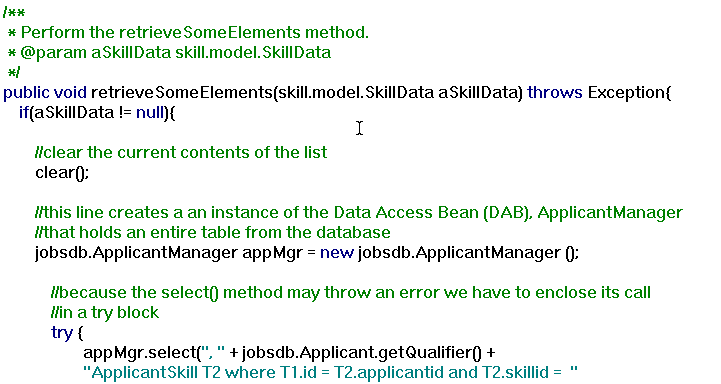 Pictured below is an example of Java Code our team "Javalin Microsystems" produced during the completion of the Personnel Placement Agency Project. Here I have chosen to display the retrieveSomeElements method. This method was in charge of retrieving information from the data brokers based on Applicant ID. Note the green code comments for further explanation of the steps the code takes on to achieve this task.