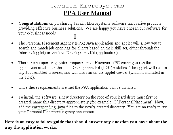 Shown below is the cover page constructed for the Personal Placement Agency User Manual. Our team, "Javalin Microsystems" constructed this user manual for the potential users of this object orientated Visualage application. Click on the User Manual.doc link to your left to view the entire document in MS Word format.