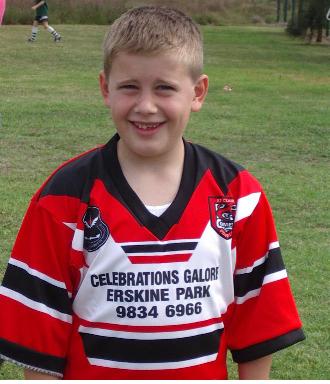 Travis wears the number 7 jersey for the Under 8/2's - he enjoys scoring tries, tackling and spending time with his friendly team-mates. His favourite teams are Souths, Roosters & Newcastle and his favourite player is Brad Fittler. Travis hopes to someday be as good a player as Brad so lots of people can see him on TV! His likes include swimming, lollies and wrestling. He enjoys the Lord of the Rings movies and Beybladz, he prefers not to have to go to bed most nights and he definitley hates vege's! Travis' birthday is 1st November 1995.