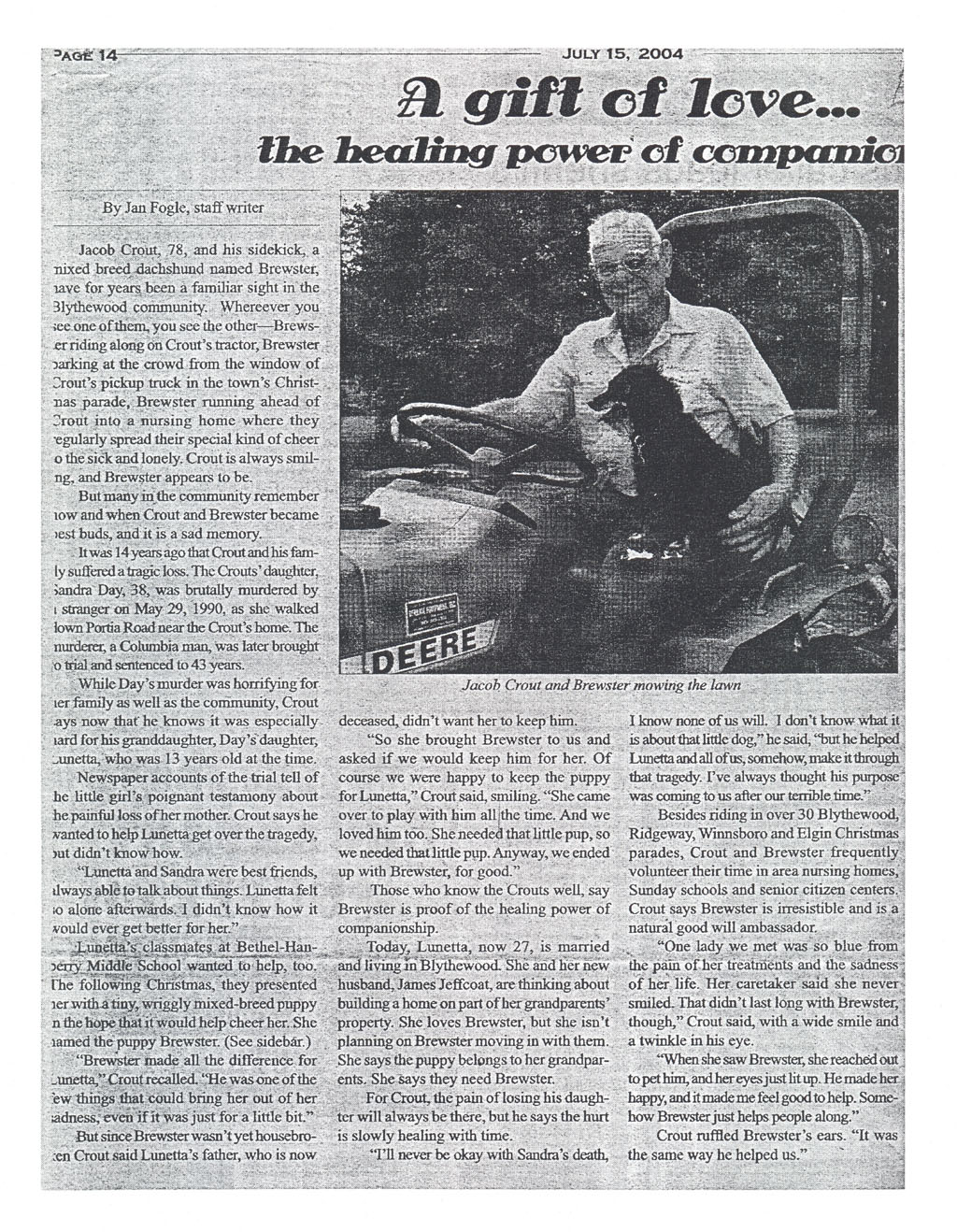 Blythewood Country Chronicle, July 15, 2004. This is a very touching piece assigned to me by the publisher at the Country Chronicle. I had some trouble on writing this one, so she brought a more experienced reporter to help with that. My organization was left intact, though, and I did do all the research for this piece.