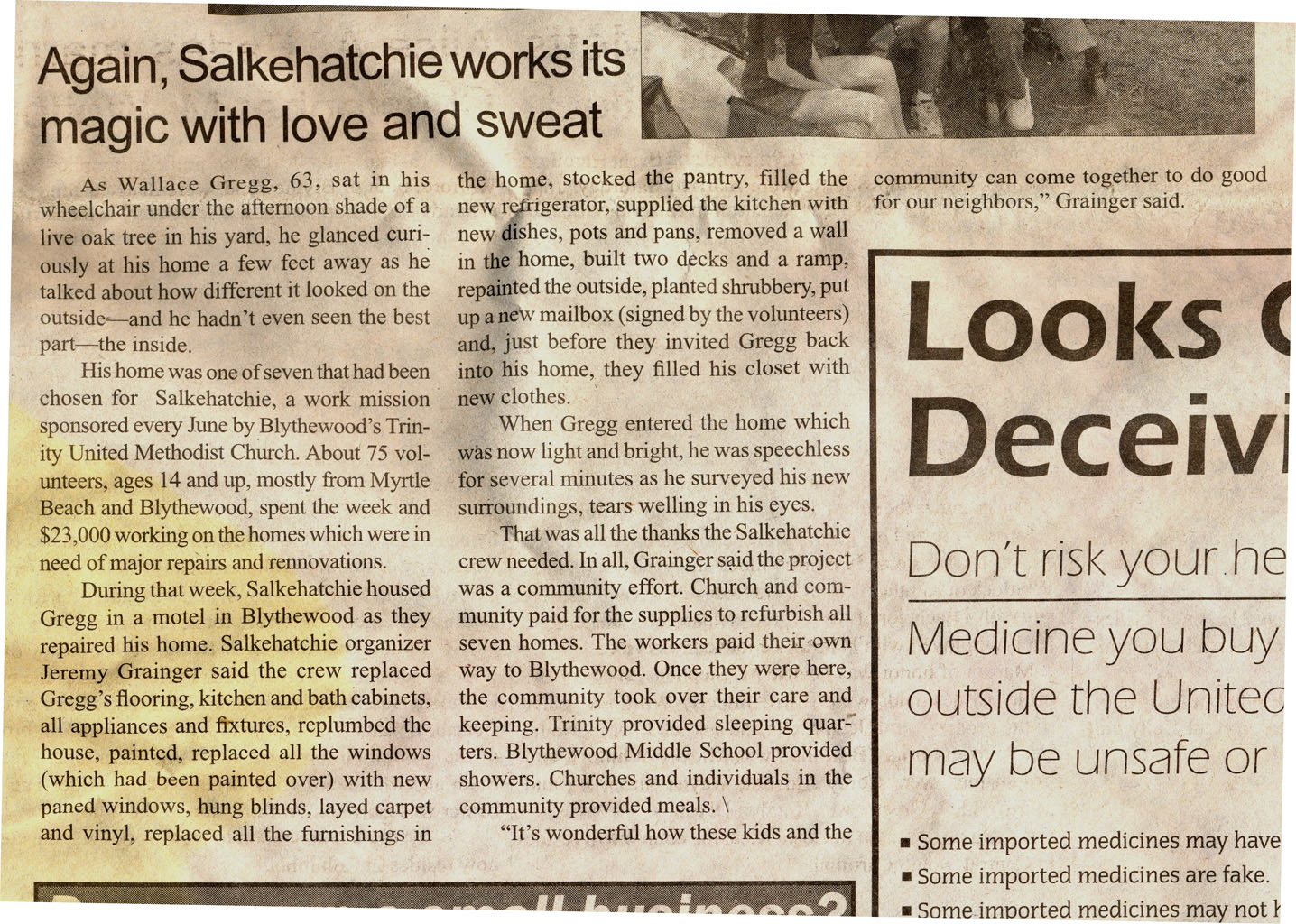 I don't know if I did all the writing or not with this piece, but I'm definitely sure that I did all the reporting. Mrs. Ball, my editor and publisher, edited all my work, and she probably changed a lot with this piece. I remember going with the Salkehatchie group to all those houses, though, and following up on their progress throughout that week. Mrs. Ball forgot my byline for some reason, but she'll back me up that this is my article.