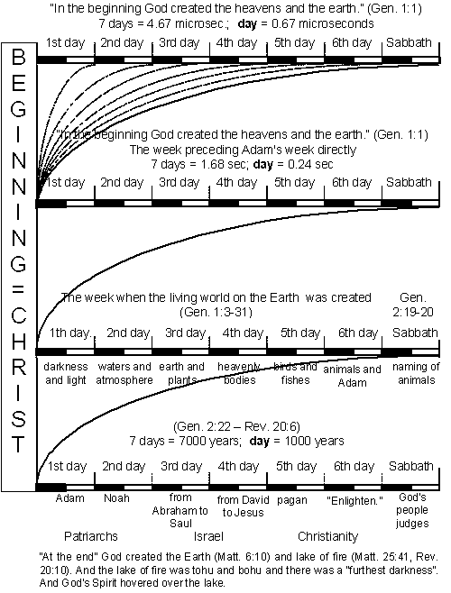 This latest conclusion agrees right with the following result of typological reasoning. Considering that every day of this new creation lasted thousand years (i.e. every night and daylight five hundred years each), we conclude that also the first night of the seven days of creation (i.e. the period of “darkness on the face of the deep” /Gen. 1:2/) lasted half a day, same as other nights.