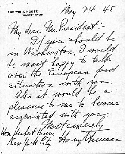 In 1945 President Harry S. Truman invited He wanted Hoover to organize food relief for Under Truman he served as coordinator of food Under President Eisenhower, Hoover was made