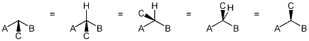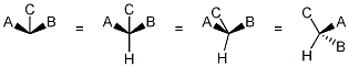 When depicting tetrahedral configuration around a stereogenic atom, the following depictions may be considered. Each of these depictions can be freely rotated in the plane of the paper without affecting the configuration being represented.