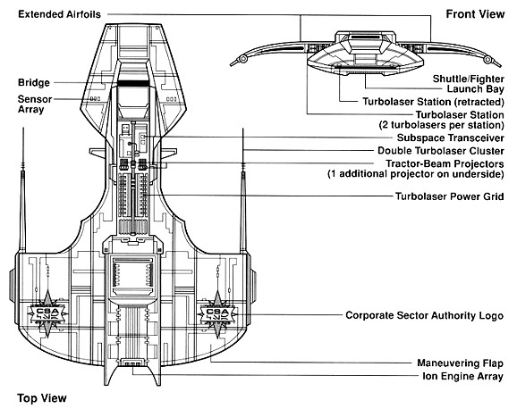 武器:雙管增壓雷射炮x8﹝2前、後、左、右﹞,牽引光束x3﹝2前,1後﹞,加裝額外的能源產生器時可再加裝4門增壓雷射炮