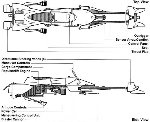 74-Z有兩個伸出的腳架,上面有四個控制舵,操縱桿位於手把上,高度控制位於腳踏板。通訊、感測和武器控制在車座中前方,車座之下有個小型貨艙。控制功能可重新設定,有些偵查士兵喜歡將加速放在手把上。機車的底部是方向控制器﹝和前方的控制舵相連﹞和一門單管輕雷射炮。尾端則是能源電池和反重力引擎。