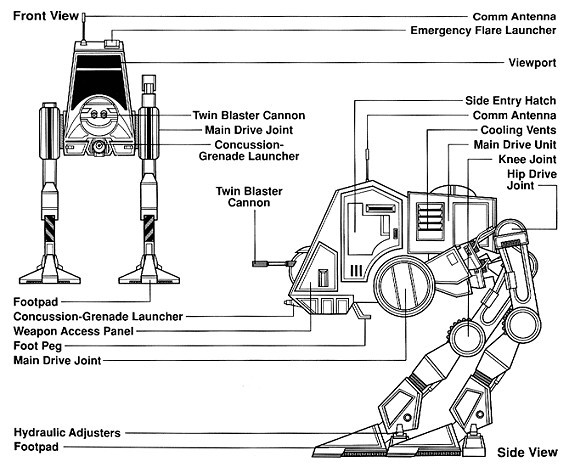 AT-ST比AT-AT小但速度快而輕巧,原本設計為偵查任務用,因此常單獨行動,同時也是傑出的巡邏、陣地防禦、反人員獵殺、支援帝國地面部隊和AT-AT的步行載具,而被帝國用於支援前線、步兵支援和AT-AT側邊的防禦,以快速機動的護衛能力著稱。