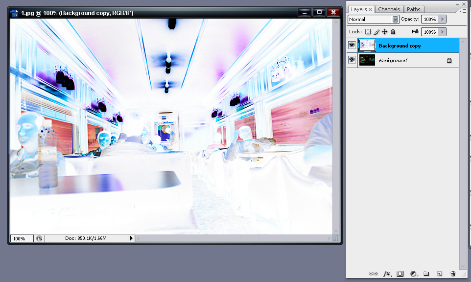 הצעד הבא יהיה להפוך את הצבעים לנגטיב, כדי שכל החלקים החשוכים יופיעו בעצם בצבע לבן או בגרסא היותר בהירה שלהם , כדי לעשות את זה נכנס לתפריט Image--Adjusments ---Invert או ctrl+I בשביל הקיצור דרך