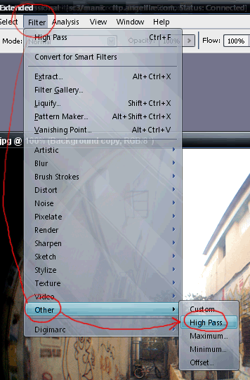 עכשיו אחרי שנוודא שאנחנו נמצאים על ה layer העליון נכנס לתפריט Filter ומשם ל Other ולבסוף נבחר ב hight pass
