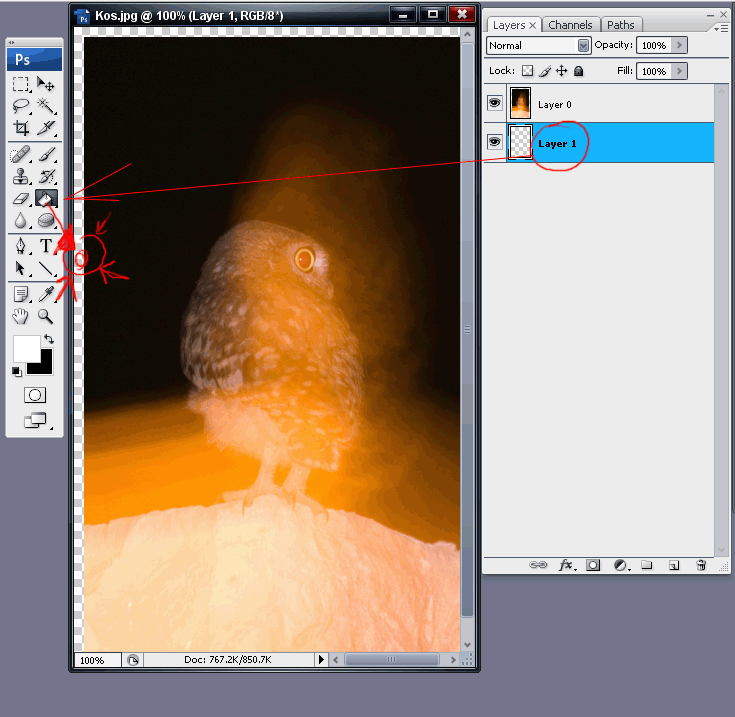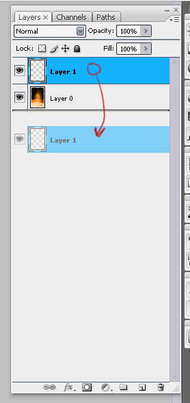 עכשיו תוך כדי לחיצה ממושכת על הLayer1 נגרור אותו בחלון ה Layers אל מתחת לשכבה עם התמונה שלנו ועכשיו יש לנו layer ריק מתחת לתמונה ואפשר לצבוע אותו